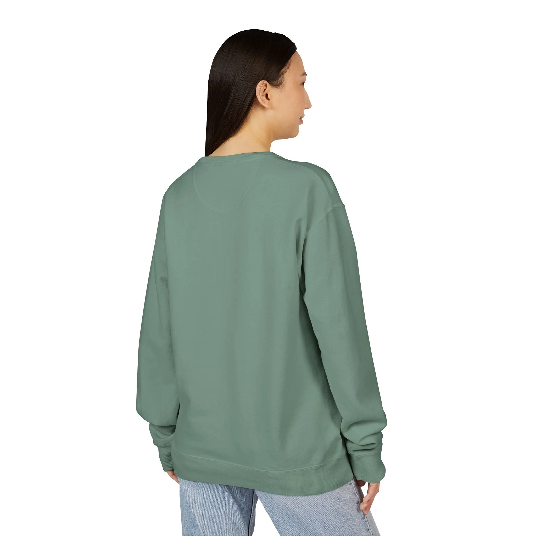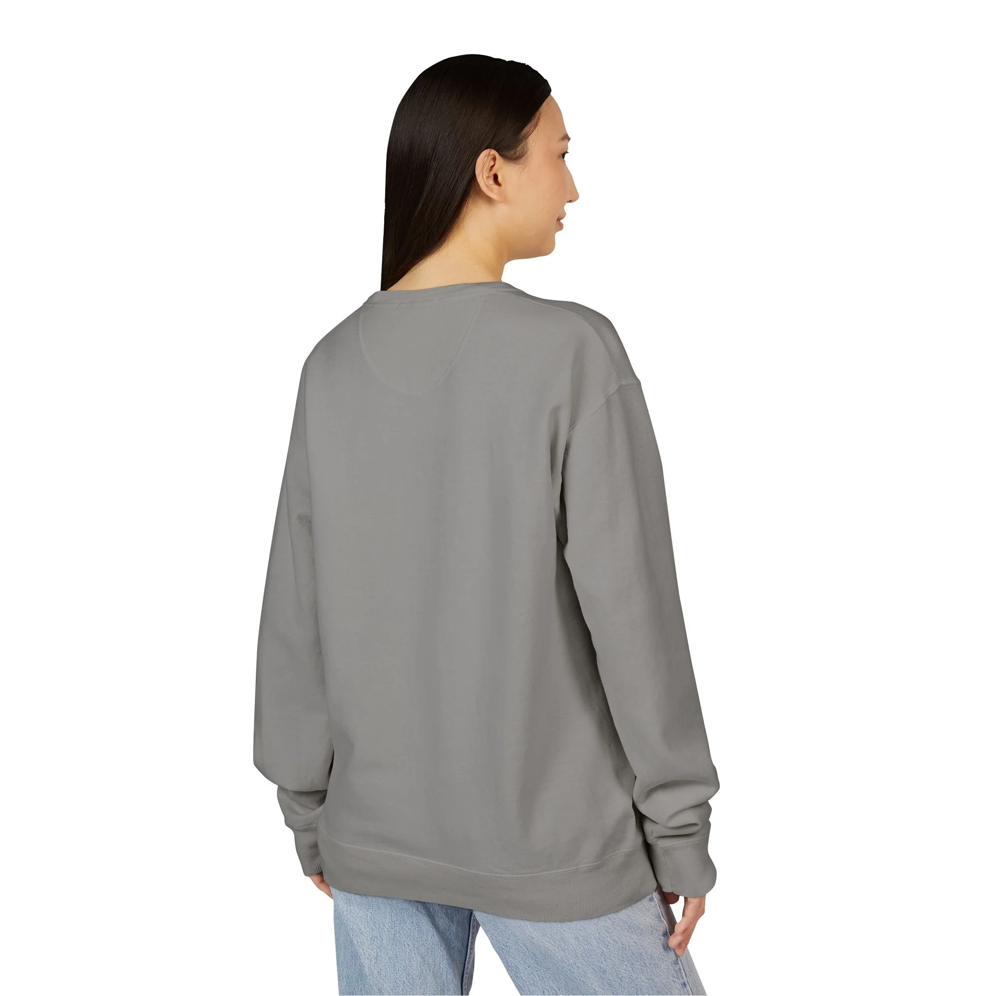 Grey garment-dyed crewneck with a bold, graphic portrait centered on the chest. The design features a stylized female face in high-contrast black and white with a punch of red lipstick, framed by a textured rectangle and vertical text along the side. The washed, vintage finish gives the sweatshirt a lived-in, retro vibe that pairs easily with jeans or layered over a tee. Breathable midweight fleece keeps you warm without bulk. Wear it when you want an understated statement piece that reads artsy, confident, and a little nostalgic.