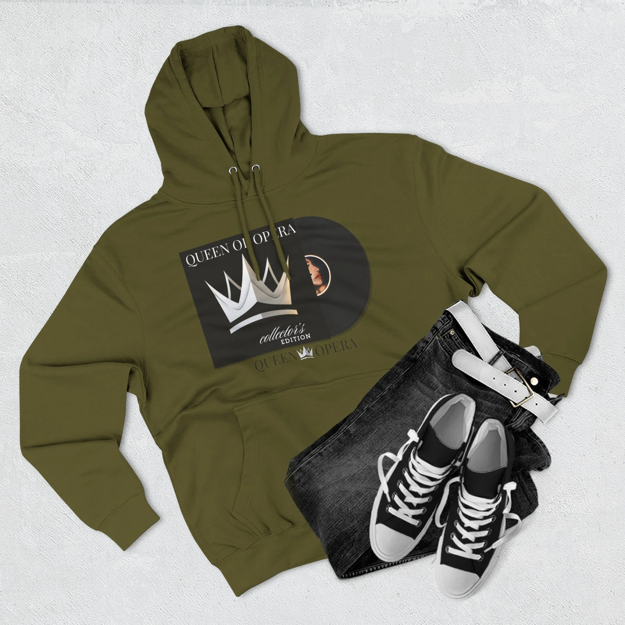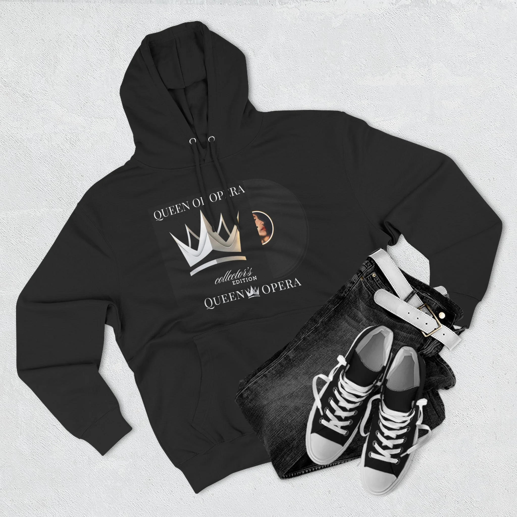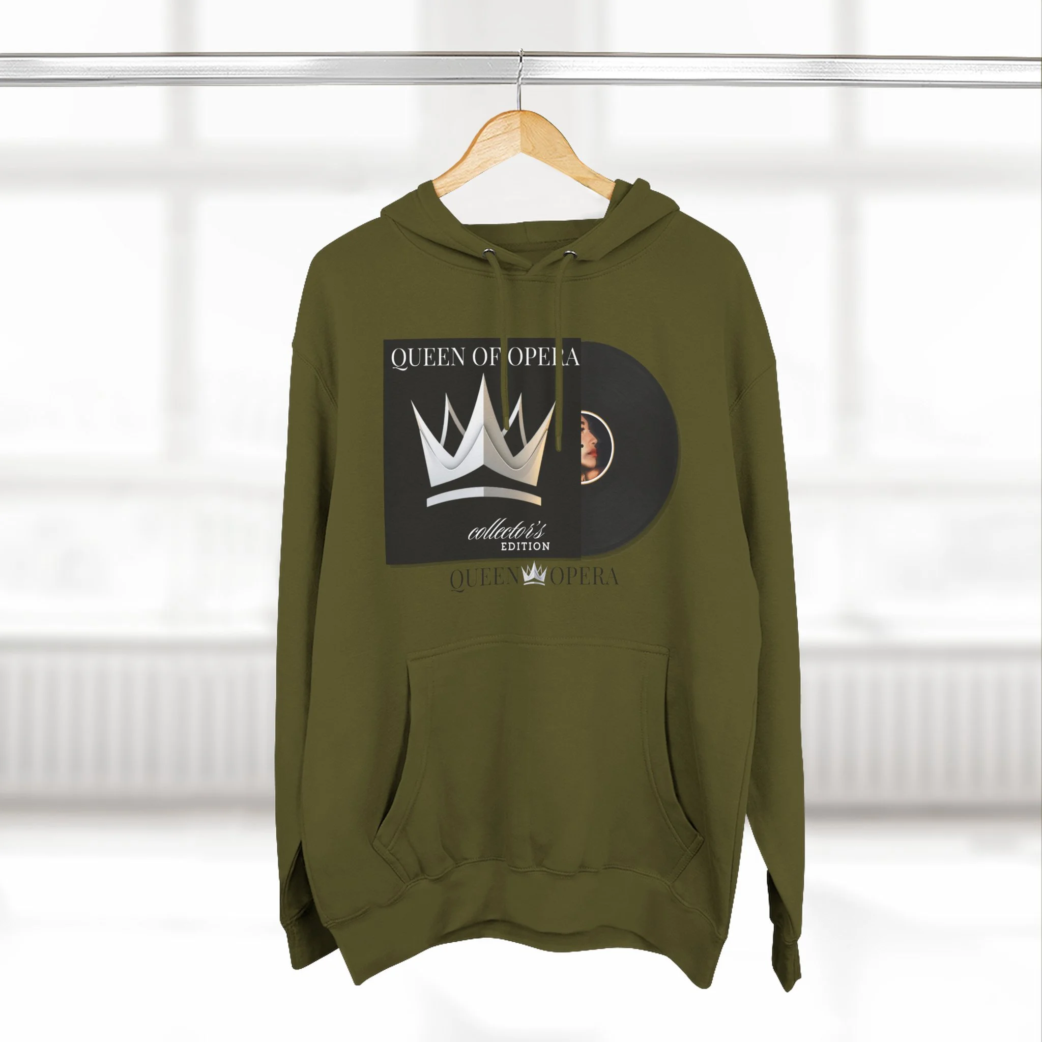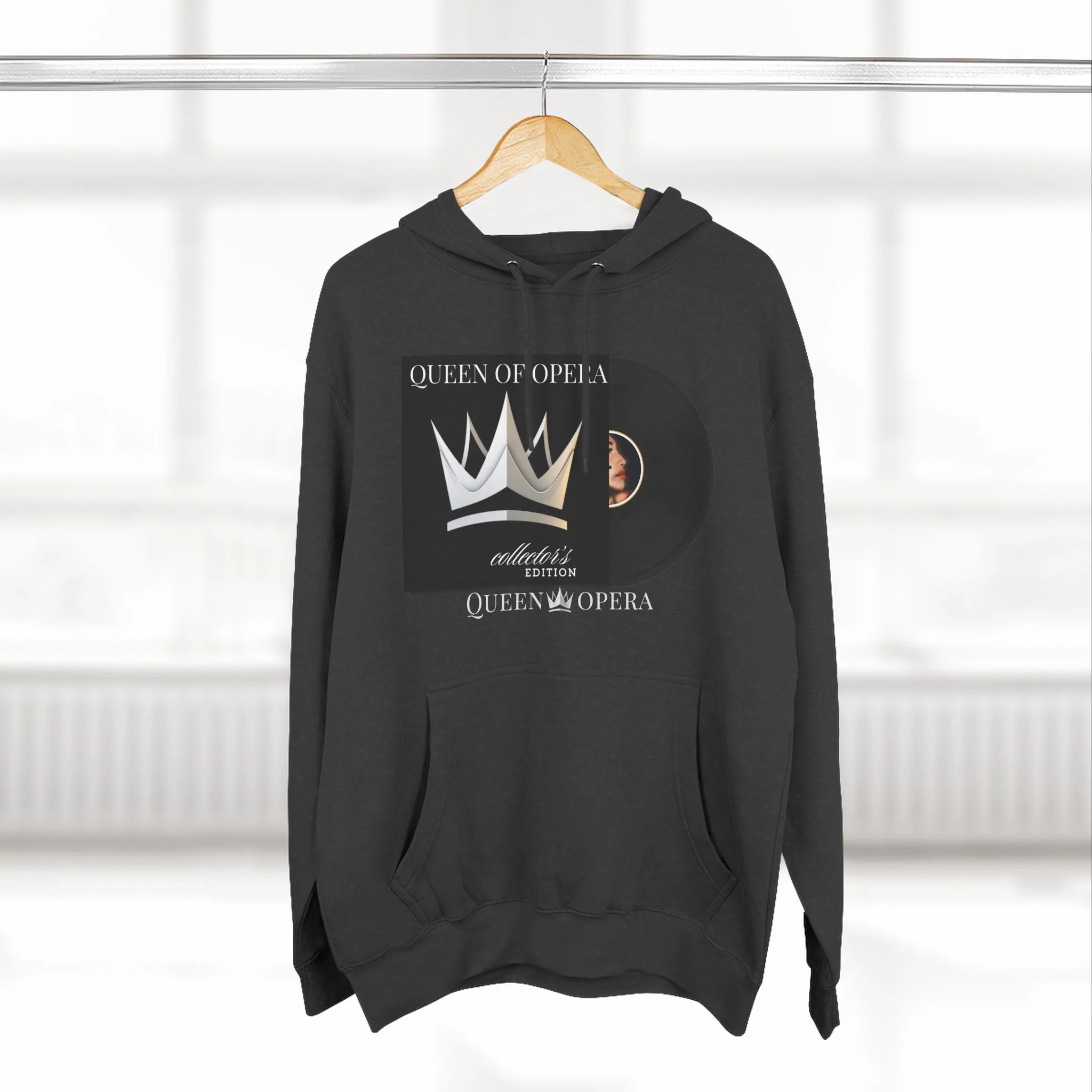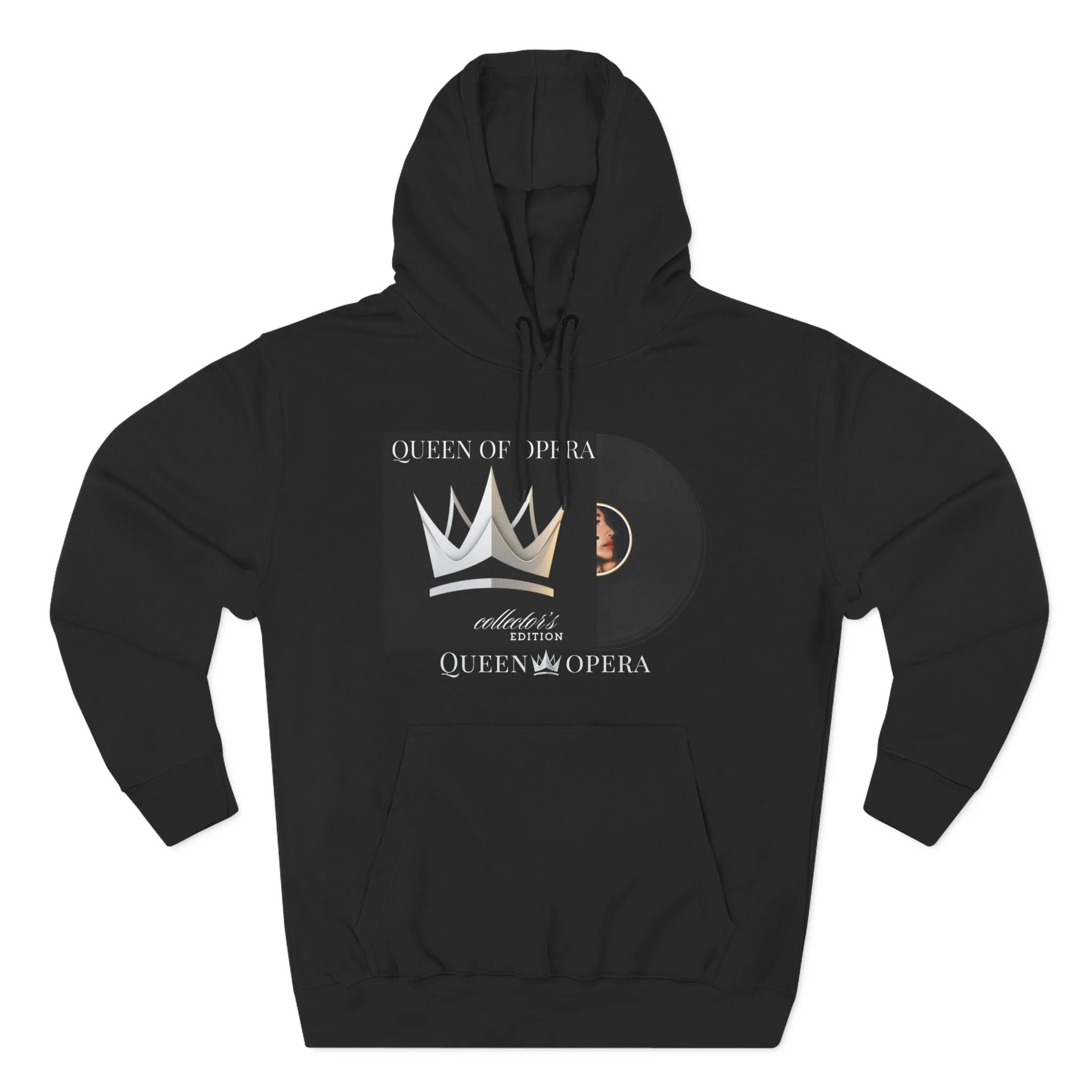 A cozy, midweight hoodie that blends vintage record nostalgia with modern streetwear comfort. The front art — a stylized vinyl record and crown motif — reads like a personal mixtape: bold, nostalgic, and quietly regal. The soft, brushed fleece interior and roomy kangaroo pocket invite slow mornings, late-night listening sessions, and pulled-up-hood commutes. Subtle embroidery options on the chest let you add a refined touch to the relaxed silhouette. This hoodie settles into your everyday rotation: warm during crisp evenings, breathable during layered looks, and made to wear while you spin records, write lyrics, or wander the city with purpose.