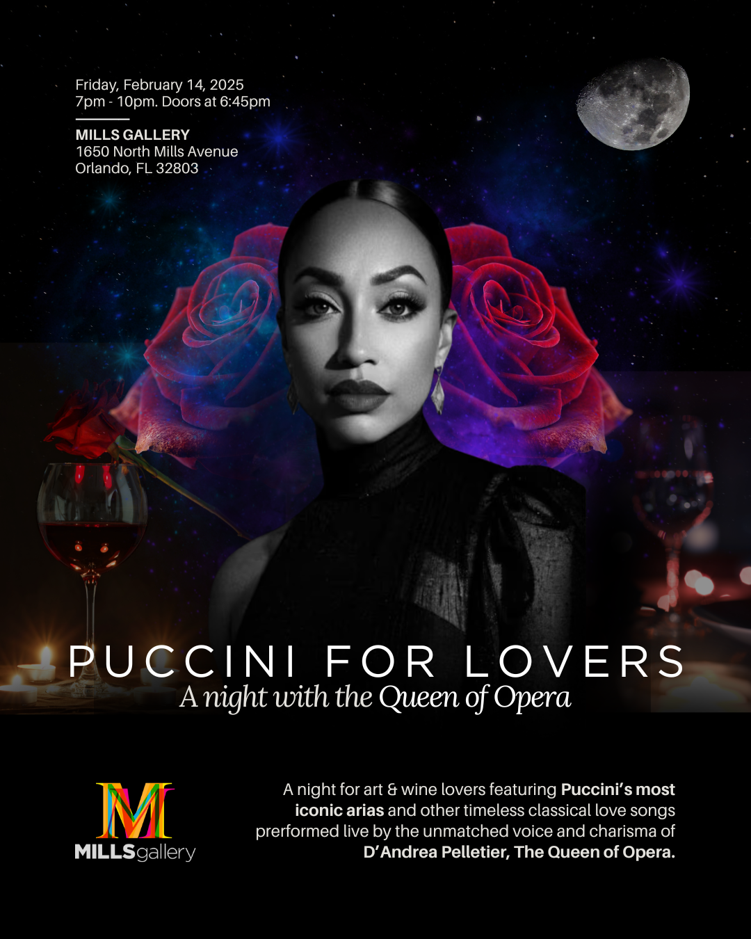This intimate celebration of love will feature the unmatched voice and charisma of D’Andrea Pelletier, classical vocalist and recording artist known as the Queen of Opera, with special guest performances by classical violinist Sasha Korczynski of Orlando Philharmonic, and pianist John Korczynski of Opera Orlando.
